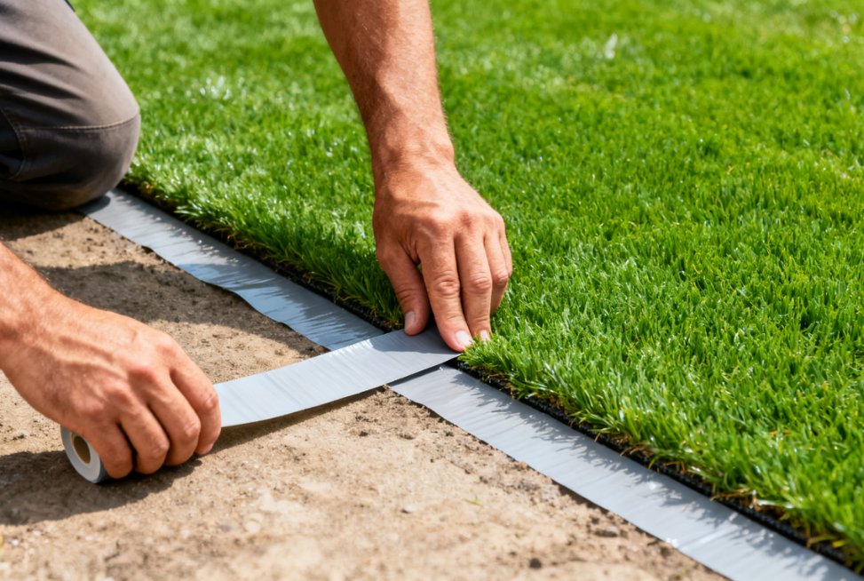 Unroll the turf and let it rest under the sun for a few hours to relax creases. Trim edges neatly to fit the shape. Lay pieces side by side with fibers facing the same direction. Use seaming tape and adhesive for seamless joints. Secure turf edges with landscape nails every 6–8 inches to ensure lawn stabilization.